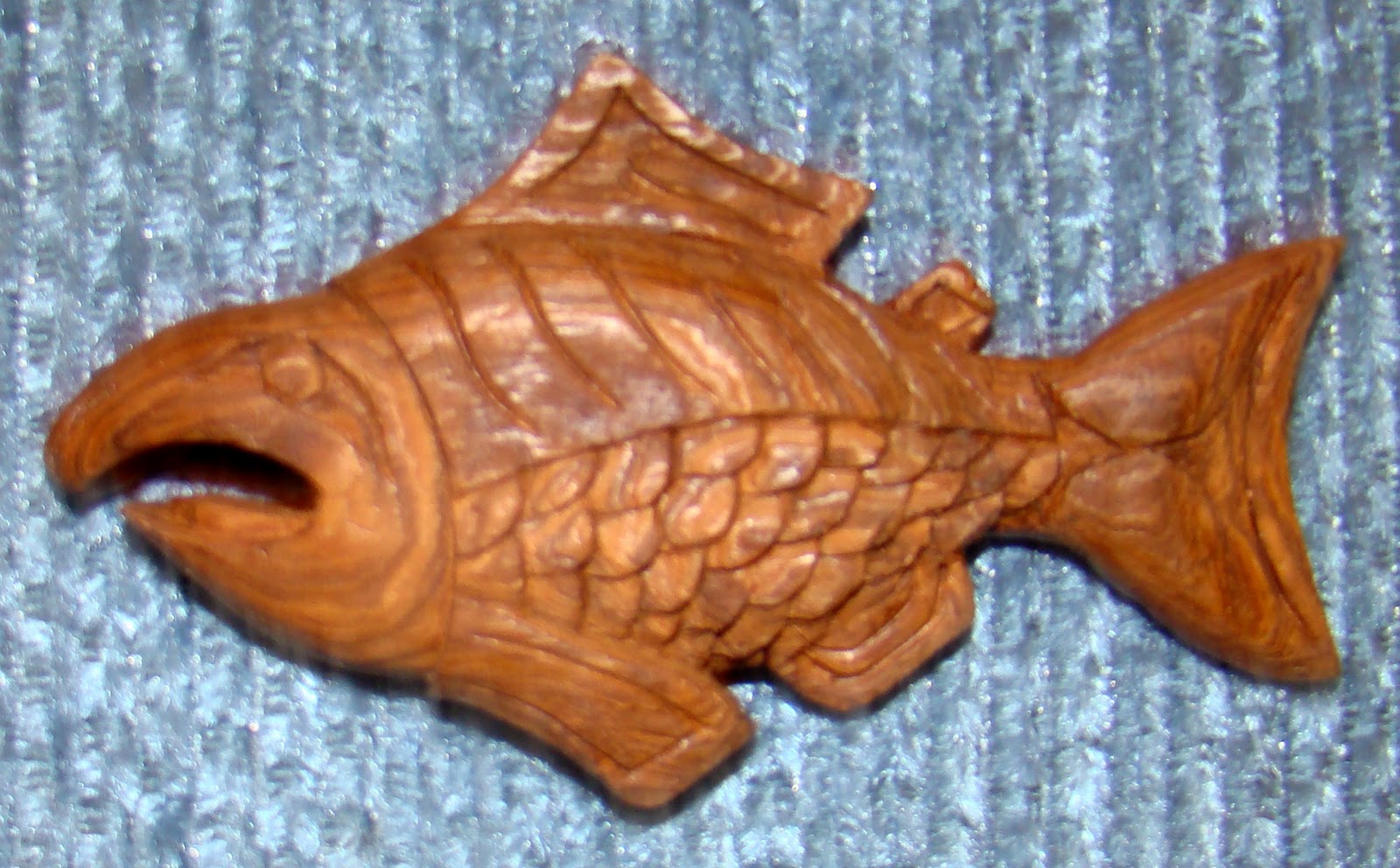 This is fish carved out of a 4 inch long piece of cottonwood bark. It fits nicely between the area by the doors of the upper cabinets in our motor home. Too bad the material in the background ran vertical and not with the salmon swimming up the river to spawn.